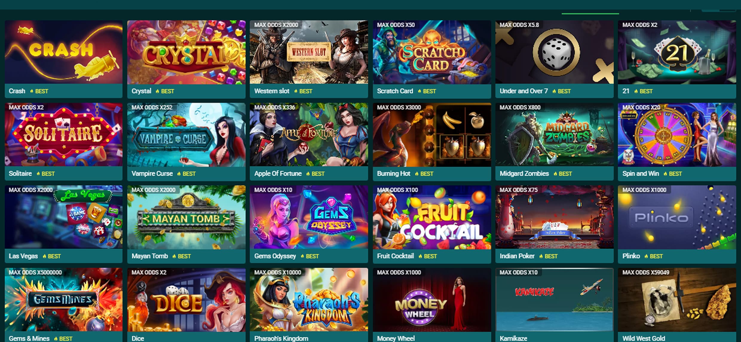| Poskytovatelé her | Evolution, NetEnt, Microgaming, Pragmatic Play, Play’n GO, Relax Gaming, BGaming, Red Tiger, Yggdrasil, Quickspin, Thunderkick, Ezugi, Authentic Gaming, Betsoft Gaming, 1x2 Gaming, Amatic, Habanero, IronDogStudio, Nolimit, Platipus, PlayTech, Spinomenal, Evoplay, Endorphina, ELK, EGT a další |